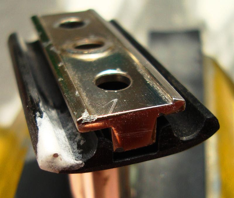 Der Längsriss in der Griffhülse wurde mit Sekundenkleber behandelt. Zum Erhalt eines dauerhaften und auch noch ansehnlichen Reparaturergebnisses wurde der Riss bei der Verklebung mit einer über die Griffhülse geschobenen Schlauchschelle geschlossen und überflüssige Kleberreste anschließend vorsichtig mit einer Diamantfeile entfernt. Das Ergebnis dieser Behandlung ist in der Abbildung 4 zu sehen. Der Längsriss fällt jetzt kaum noch auf. Das Festhalten und Führen des Hobels bei der Rasur wird durch die Verklebung nicht eingeschränkt.